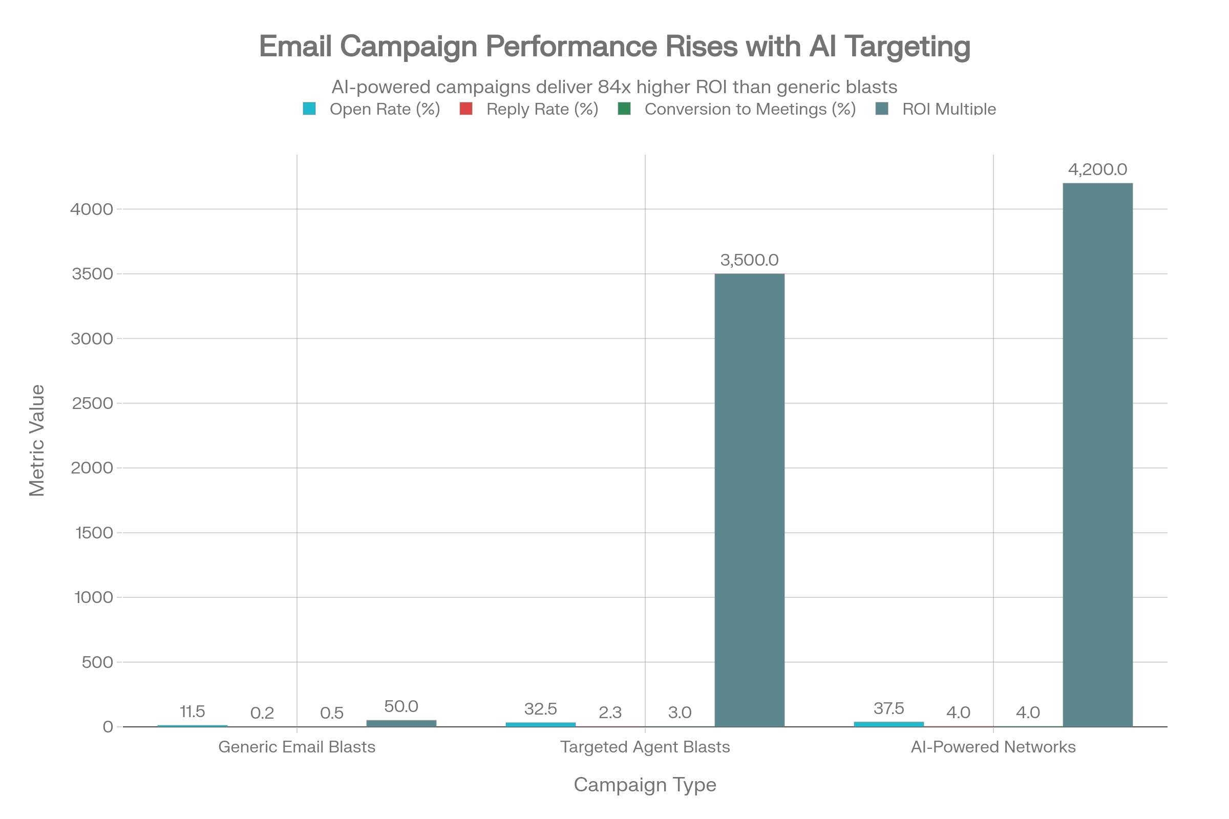 | Metric | Generic email blasts | Targeted agent blasts | AI-powered agent networks |