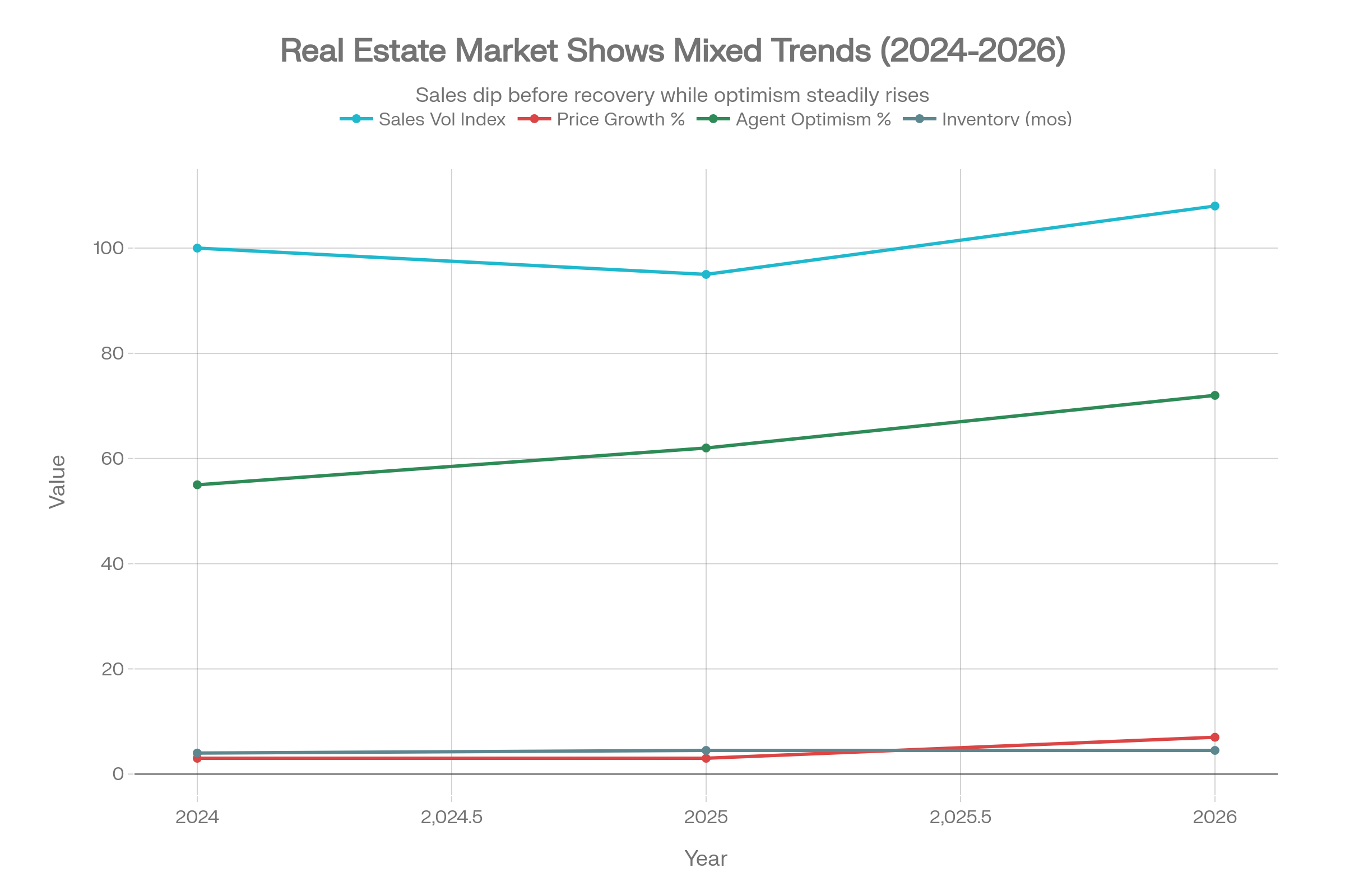 The second chart tracks a home sales volume index, price growth, agent optimism, and inventory levels from 2024 to 2026. The index dips in 2025 and then rebounds in 2026, price growth accelerates, and agent optimism climbs, while inventory moves from very tight toward more normal levels.